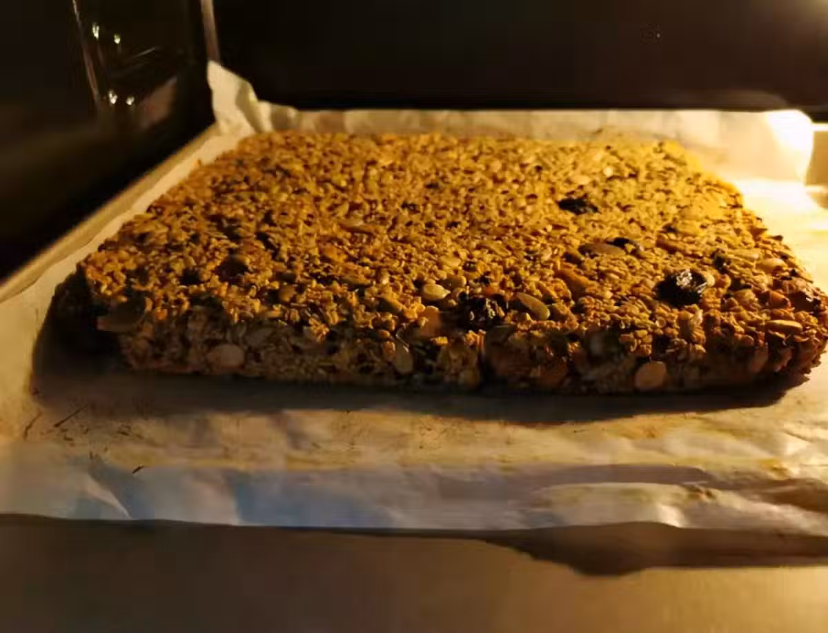 烤好的燕麥堅果能量棒放涼之後就可以切塊了,用密封袋包裝起來,也可以用糖紙單獨包裝,不受潮的情況吃上三五天是沒有問題的。