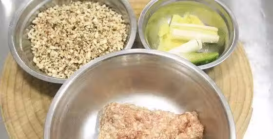 切點生薑片、大蔥段,把薑片和大蔥放在打漿機裡面 ,加入一點清水打成蔥姜水,等會用來調餡。