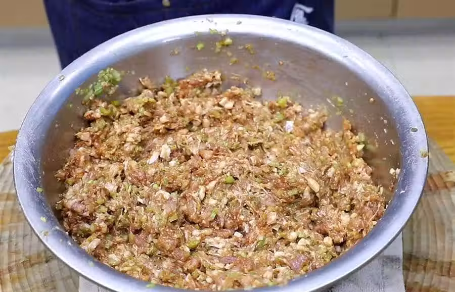 打入兩個雞蛋即增加嫩滑,同時也增加了餡料的飽合力,使肉餡更容易成團,最後放入蔥花,多淋一些芝麻香油既增加香味還能鎖住水分,再澆上一勺熱油把蔥香味激發出來,順著一個方向快速攪拌讓油和肉餡充分融合,這樣才能達到增香鎖水的效果,攪至能清晰看到黏調說明已經打好了。