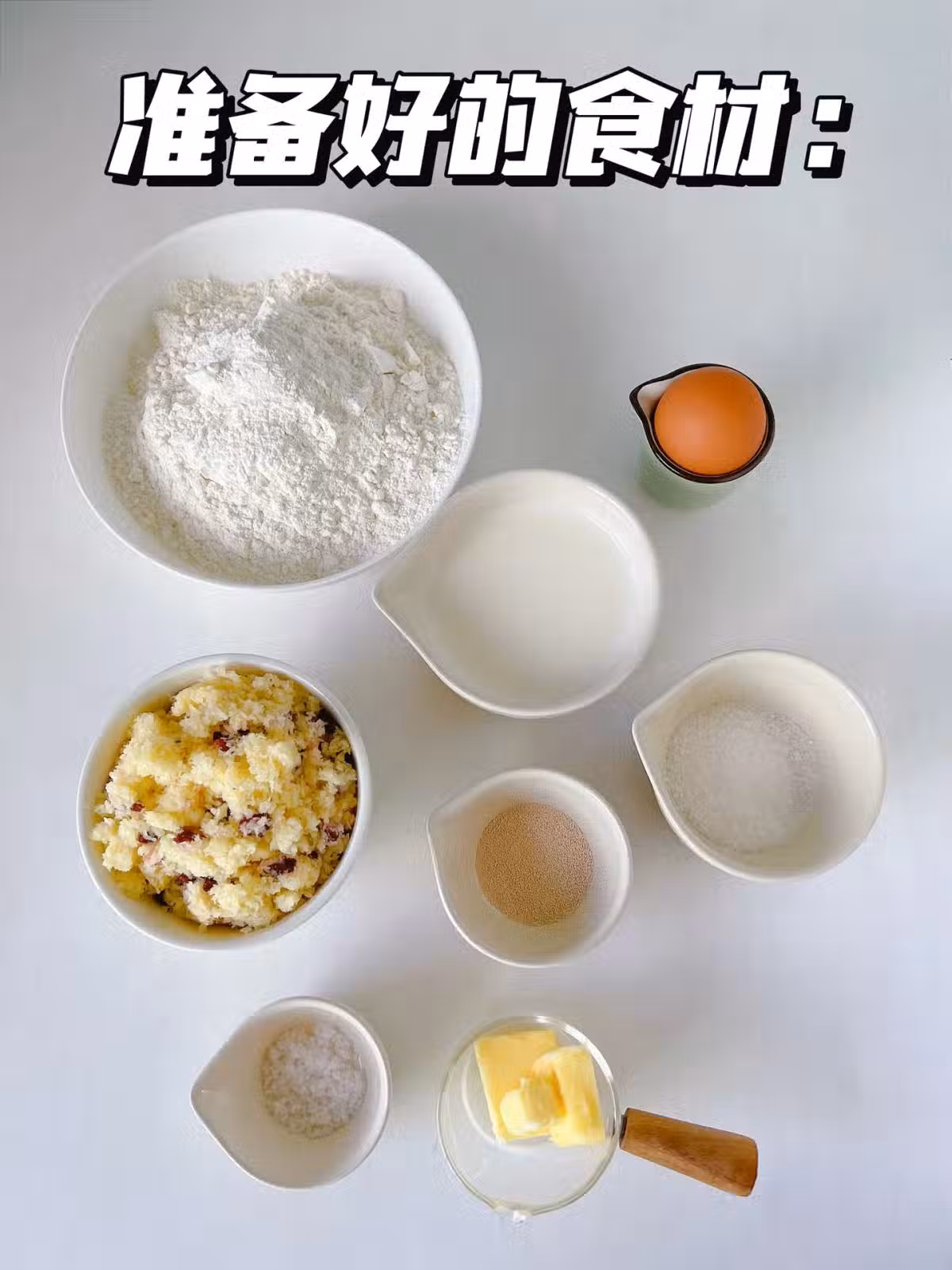 麵糰: 高粉250克、牛奶130克、糖30克、鹽2克、酵母3克、雞蛋1個、黃油20克