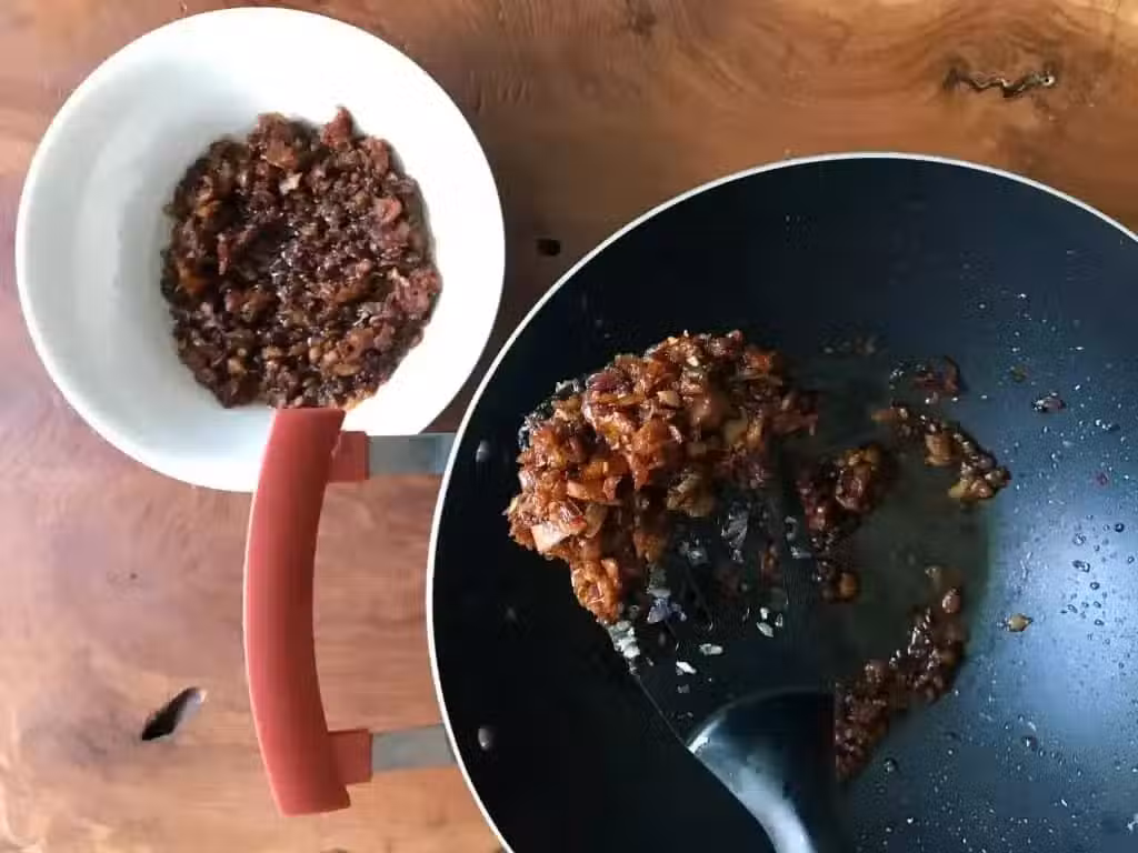 1. 燒熱2大匙熱油, 加入菜脯碎炒至香。