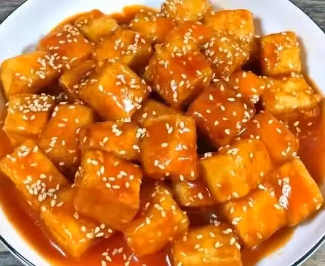4.鍋中留底油,放入蒜末爆香,倒入醬汁煮至粘稠,放入豆腐翻炒均勻,讓每塊豆腐都裹上調料汁,出鍋撒上白芝麻。這款豆腐湯汁濃郁,豆腐吃起來外焦里嫩。