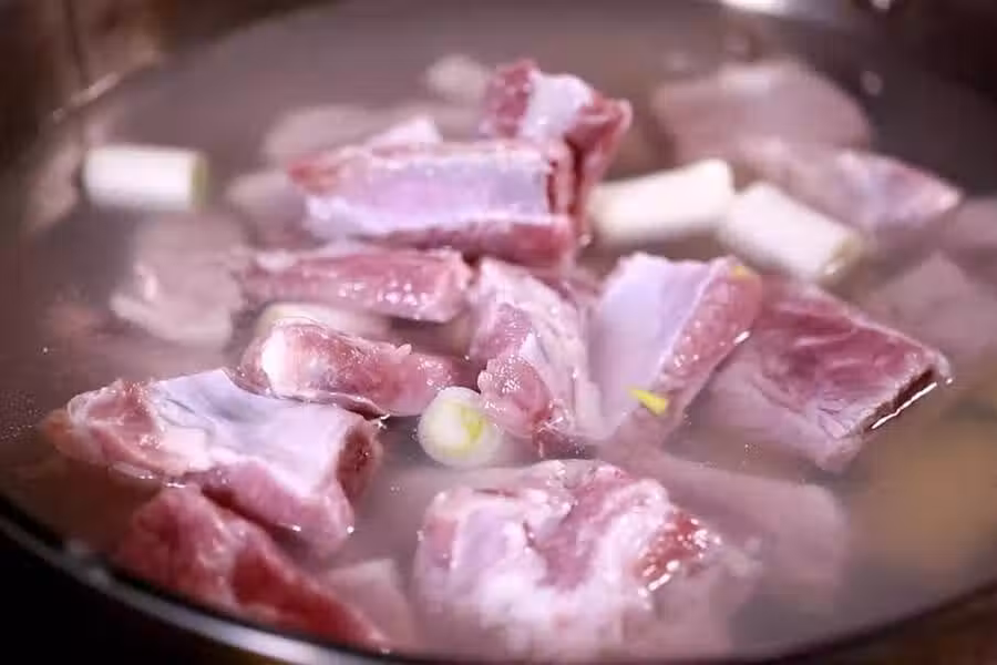 4、 準備一盆水,倒入適量的白醋,再把蓮藕放進去浸泡著,這樣等下鍋之前,再將蓮藕撈出來,就不會發黑了,這是第二招。再把排骨準備好,清洗2遍以後,直接倒在鍋子裡,加上適量的清水,倒上適量的料酒,等大火燒開之後,將上面的沫子撇出來。