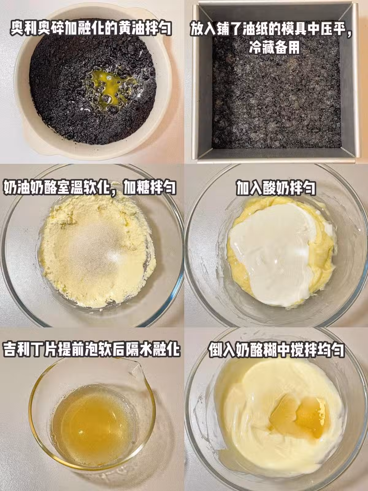 ◆奧利奧餅乾碾碎,加入融化的黃油拌勻,放入鋪了油紙的模具中壓平,放冰箱冷藏備用