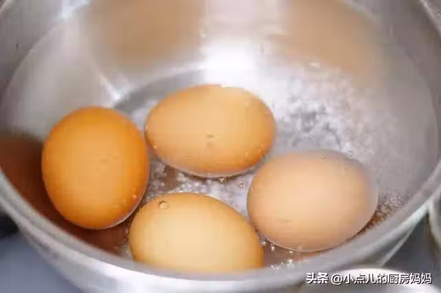 在煮雞蛋的水裡放入幾滴醋和少許鹽,放入雞蛋後煮熟。 完成這一步驟需15分鐘。