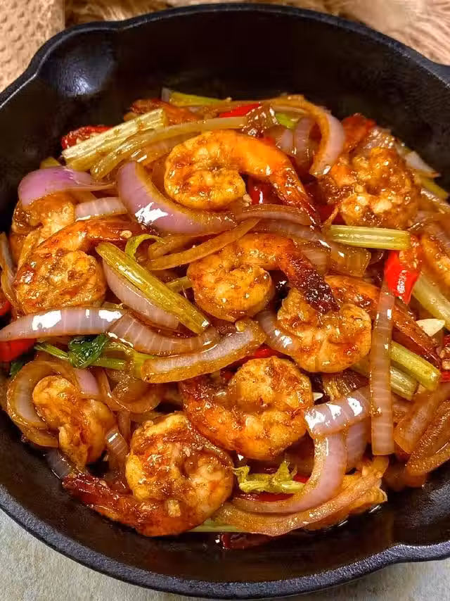 2、油熱倒入蝦炒至微焦黃盛出,留底油炒香蒜瓣加入配菜炒香(洋蔥絲、小米辣、干辣椒、芹菜)加一點鹽和老抽炒勻