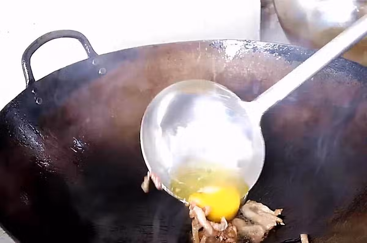 第四步,起鍋燒油,油溫五成熱時下入五花肉,煸炒出油汁,再磕入一個雞蛋,把雞蛋迅速劃散。
