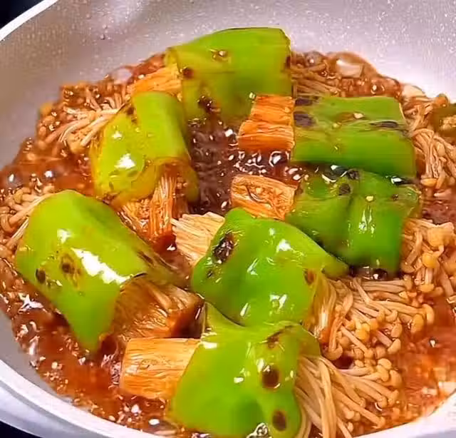 步驟三:鍋中噴油,最好是用平底鍋,把尖椒金針菇下鍋煎,,到兩面金黃,倒入料汁,蓋蓋燜2分鐘,入味,虎皮金針菇就做好了。