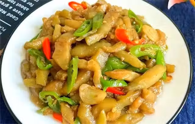 步驟一:茄子洗凈,削皮再切小條。青紅椒去籽,切成絲,大蒜切片,備用。