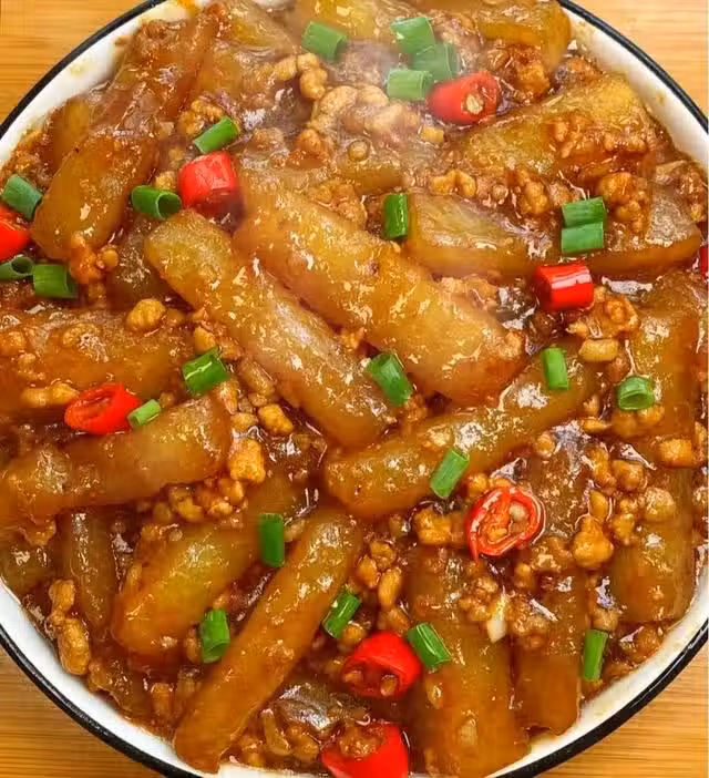 步驟一:一塊冬瓜洗凈後去皮,切成長條。大蒜切蒜末,生薑切末,喜歡吃辣的可以加一點小米辣,切碎,備用。