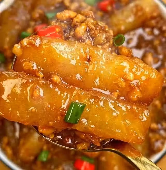 步驟二:鍋中油熱,倒入肉末,翻炒至變色,然後加入蒜末、薑末、小米辣,炒香以後放入冬瓜條,翻炒均勻,加一勺生抽、一勺蚝油、半勺老抽,翻炒入味以後,加入小半碗的澱粉水,咕嘟至濃稠入味,出鍋撒點蔥花即可。