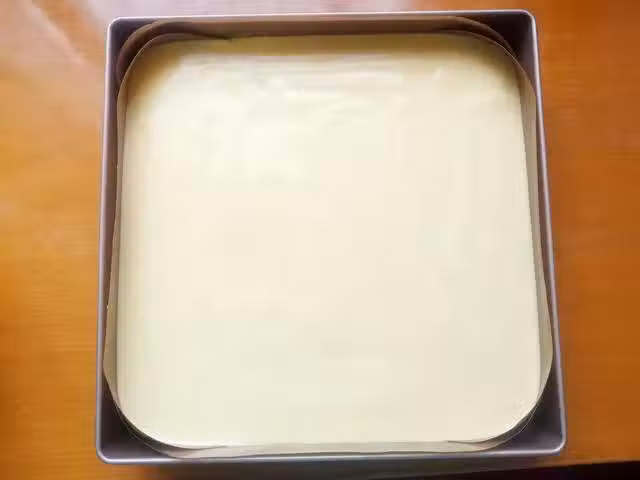 10、最後送入預熱好的烤箱中層,烤盤下面要在放一個烤盤,如下圖所示,外圍烤盤內要倒入約1cm高的溫水,用水浴法來烘烤,上下火140度烤70分鐘即可