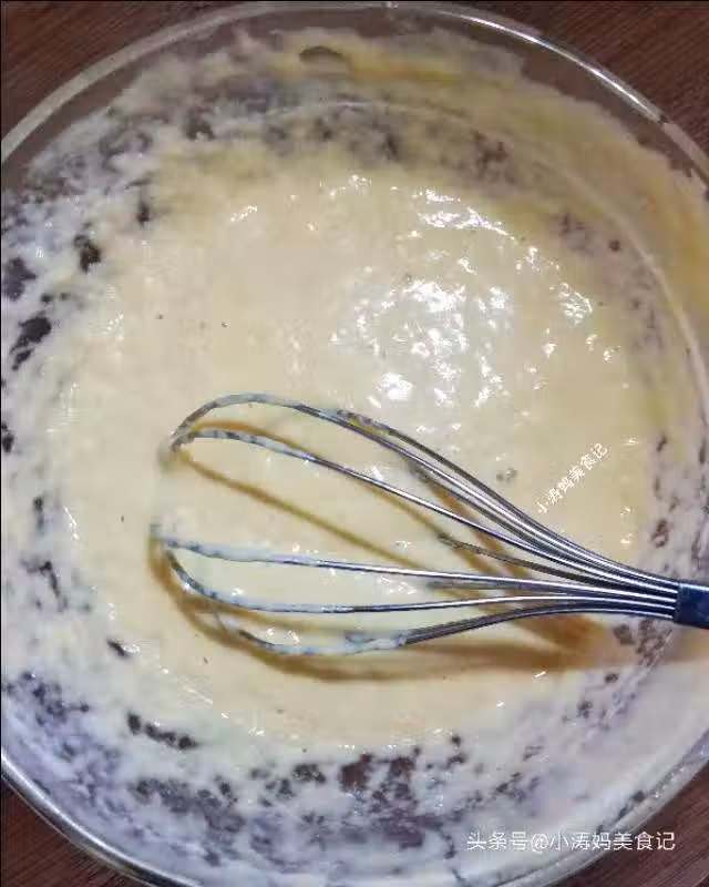 把之前煮熟的玉米粒和胡蘿丁倒入麵糊中,大概放入3分之2的量,留下小許後面裝飾用,再用手動打蛋器攪拌均勻。