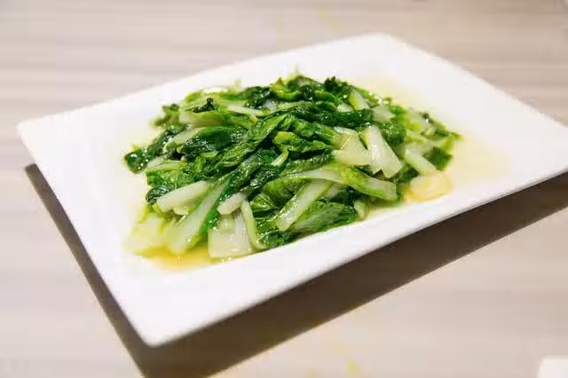 想要青菜不出水,火一定要大,鍋氣要足。想要青菜味道更香,可以選擇用豬油炒制。開火把鍋燒到冒煙,然後下入油,倒入提前切好的蔥姜蒜,爆香後,立即下入青菜爆炒,因為之前焯過水,所以很容易炒熟。翻炒10秒鐘後,加入雞汁、胡椒粉、食鹽,鍋邊在淋入少許熱水,翻版均勻即可出鍋。