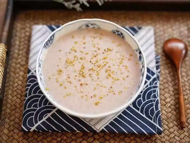 3、將打好的糊糊倒入碗內,撒上適量的干桂花提香,即可享用