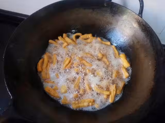 6、麵條全部炸好後,我們準備一個平底不粘鍋,將黃油倒入鍋內,用小火融化,這裡一定要用不粘鍋,因為待會要融化棉花糖,而棉花糖融化後是特別粘的,所以為了方便後續操作,大家一定要用不粘鍋。