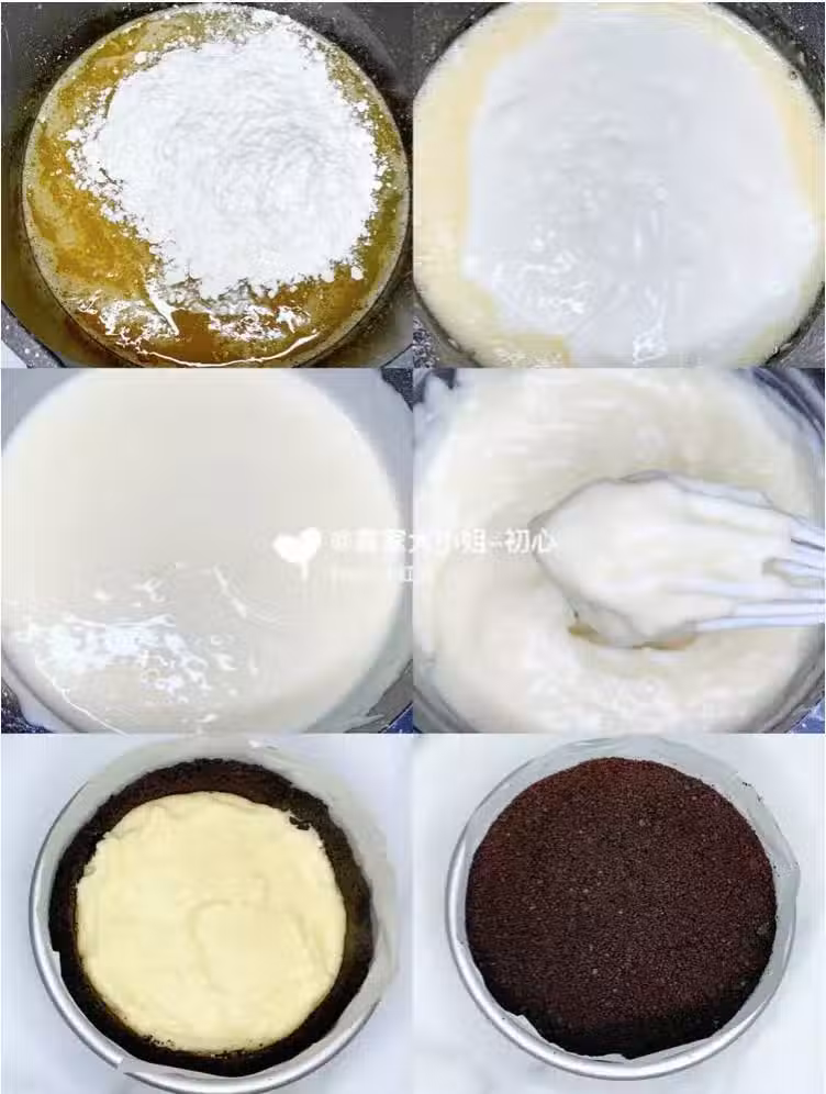 【6】將麵糊【步驟5】倒入模具里,將其餘的餅乾碎鋪滿在麵糊上【步驟3】。