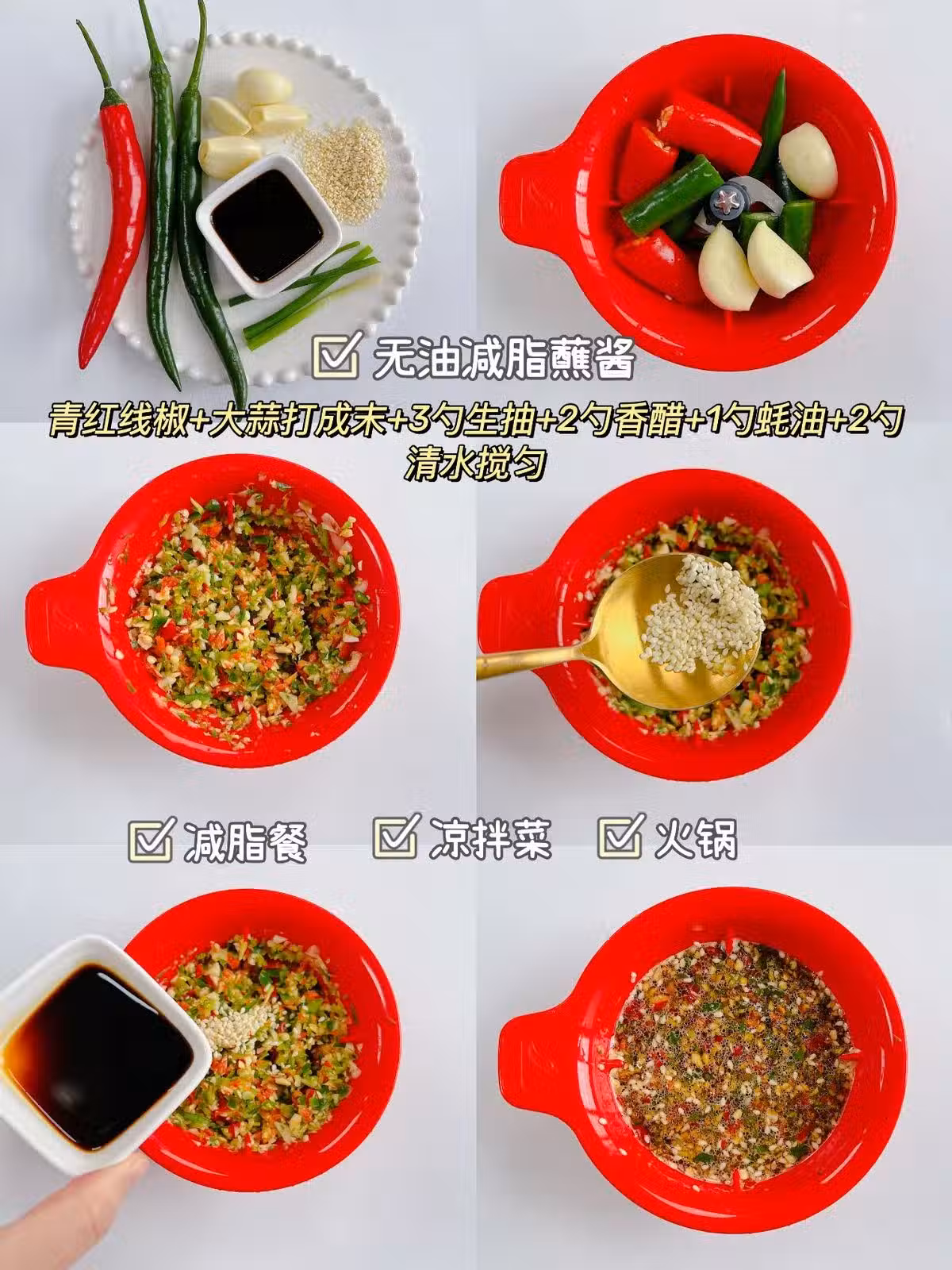 大蒜+小米辣+香醋打成末+陳醋+蚝油+醬油+白芝麻+涼白開攪勻即可。