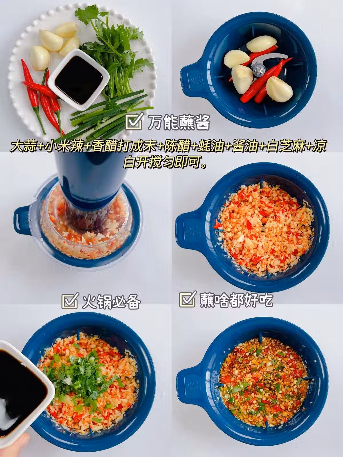 大蒜+香芹+小米辣打成末+淋上花椒熱油+加入辣椒麵+白芝麻+生抽+香醋+蚝油+少許白糖攪勻即可