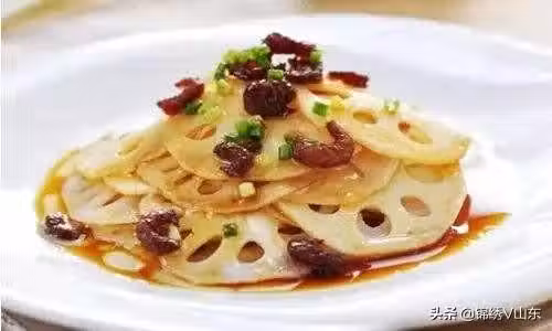 4、藕片撈起瀝去水分,擺上碟,淋上醬汁。撒點蔥花點綴即可。
