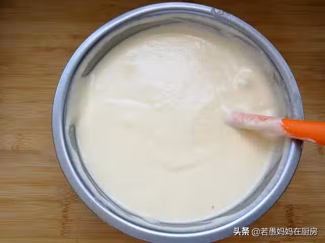 10、8寸活底方形模具裡面墊上油布或者油紙,倒入拌好的麵糊,輕振幾下,振出表面的氣泡。