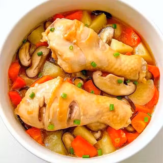 食材準備:雞腿,蔥,姜,澱粉,醬油,蚝油,鹽,胡蘿蔔,土豆,香菇等。