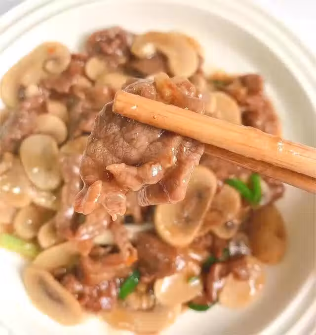 步驟四:鍋中留一點底油,下入口蘑,翻炒一分鐘,然後再下入肉片,倒入醬汁,最後放入一些蔥段即可。