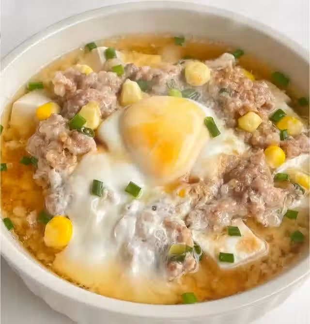 步驟二:嫩豆腐切成小塊,玉米粒處理乾淨。將豆腐鋪在碗底,玉米粒攪入肉餡中,把肉餡鋪在豆腐上,中間挖個凹槽,打入一個雞蛋,加適量清水,沒過肉餡,冷水上鍋蒸二十分鐘。