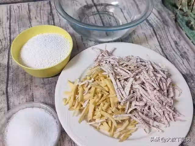 1、芋頭和地瓜,去皮刨或切成粗絲,並準備其他的食材。水和細砂糖一起放入大碗中,攪拌至細砂糖溶解。接著加入木薯粉攪拌至底瓜粉和糖水融成一體。