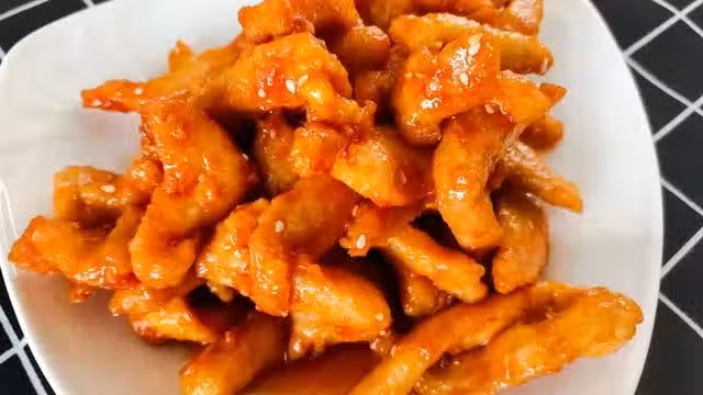 雞胸肉切塊,用鹽、胡椒粉腌制。鍋中加油燒熱,放入腌制好的雞胸肉炸至金黃撈出。另起鍋,倒入番茄醬、白糖、醋、水炒勻,放入炸好的雞胸肉翻炒均勻,使每塊雞肉都裹上番茄醬即可。