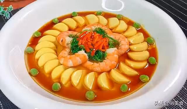 3、蒸好後取出焯水的蝦仁,中間再放些蔥絲和紅辣椒絲,周圍擺上青豆做裝飾。最後澆上蒸魚豉油和香油就完成了。