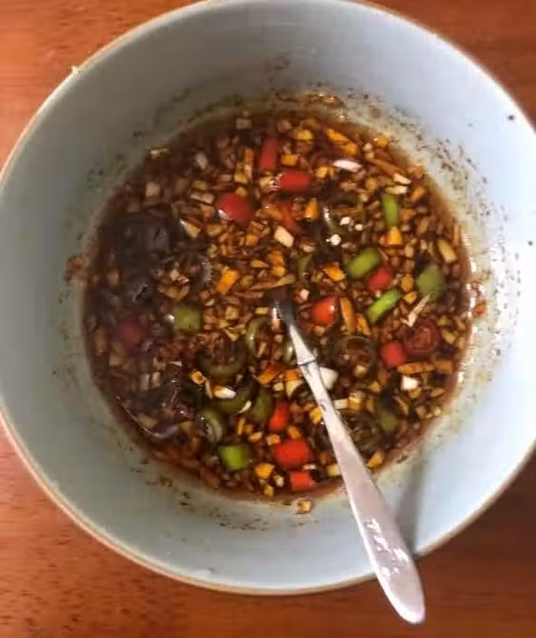 2.加入砂糖、雞粉、生抽、熱熟油拌均勻即成。可根據需要多少蘸量用小蘸點碟隨意盛上。