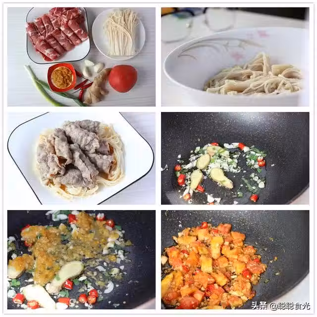 8、把金針菇和肥牛放入湯汁中煮3分鐘,就可以一起盛出來了。
