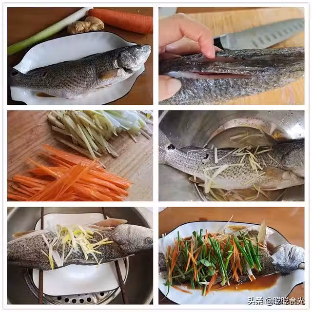 5、把胡蘿蔔絲和蔥薑絲擺在魚身上,燒一些熱油淋在上面,注意油溫高一點,才能炸出蔥香味。最後淋入蒸魚豉油,清蒸魚就做好了。