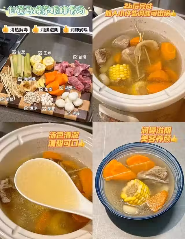 排骨、甘蔗、馬蹄、茅根1、胡蘿蔔、玉米、海底椰、茯苓、薏仁 、姜