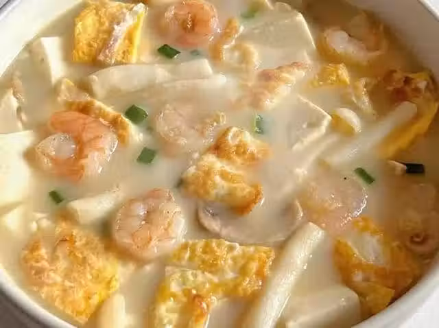 口蘑、海鮮菇、蝦仁、雞蛋、嫩豆腐、蔥姜蒜