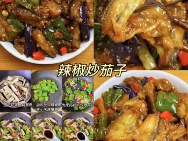 茄子切條上鍋蒸熟,油熱加入辣椒煎出虎皮