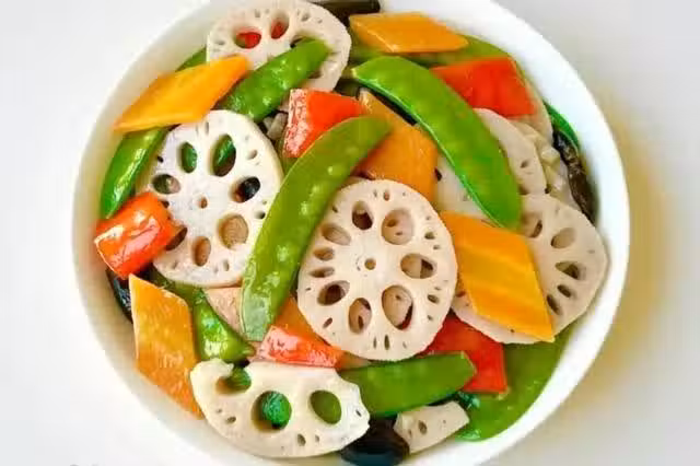 食材:荷蘭豆、木耳、蓮藕、胡蘿蔔、紅椒、蒜、鹽、澱粉、雞精