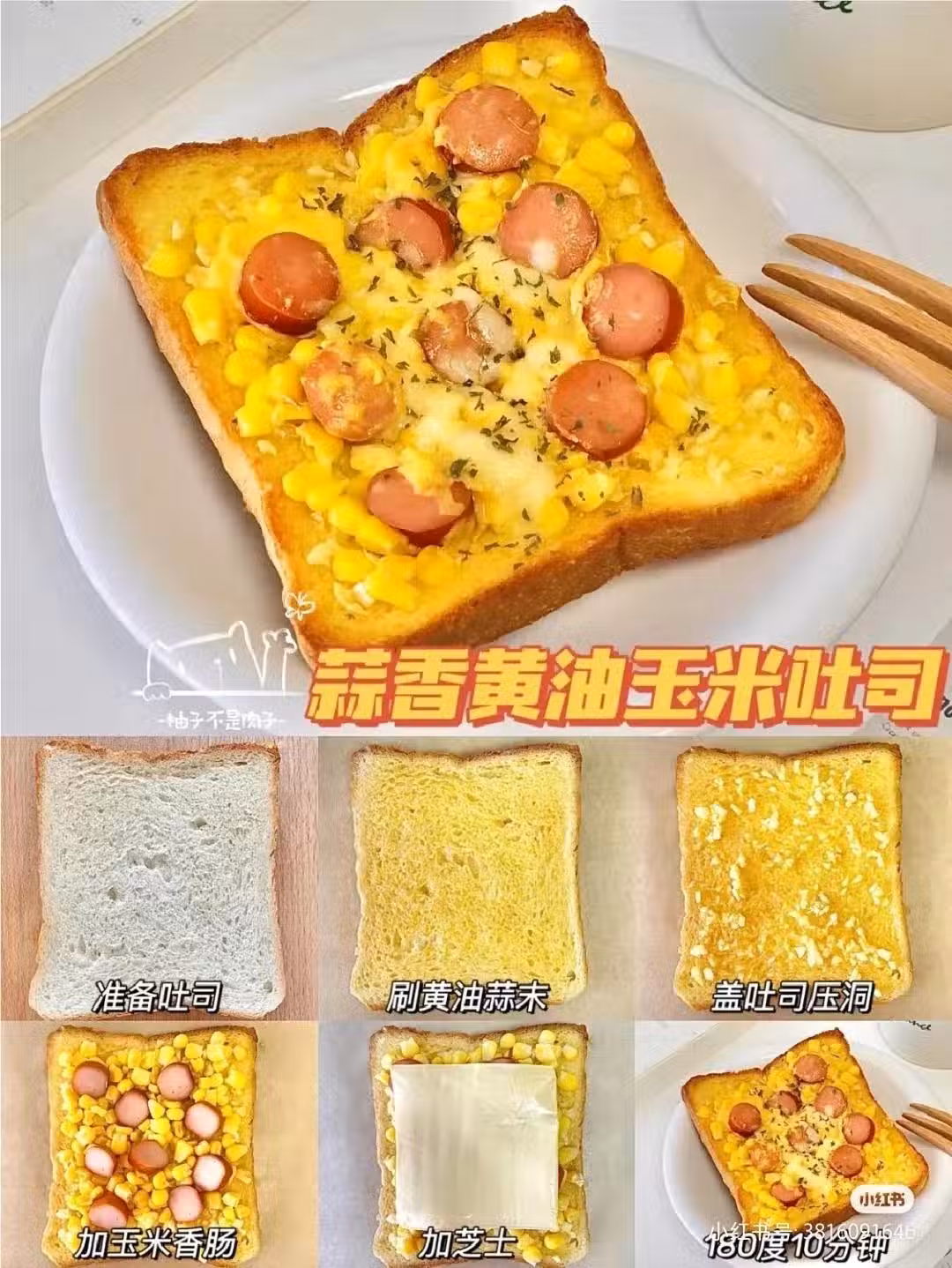 吐司、黃油、蒜末、玉米粒、香腸、芝士