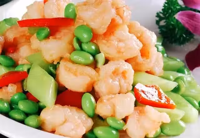 3、依次放入毛豆和芹菜翻炒均勻,加入鹽、蚝油和醬油;