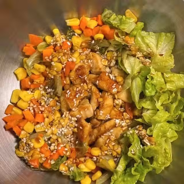 雞胸肉、蔬菜、胡蘿蔔、玉米粒、生菜
