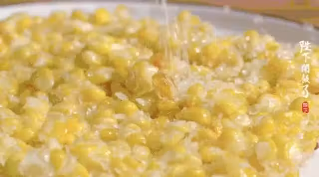 3、向鍋內下玉米粒,用勺子將其攤平。