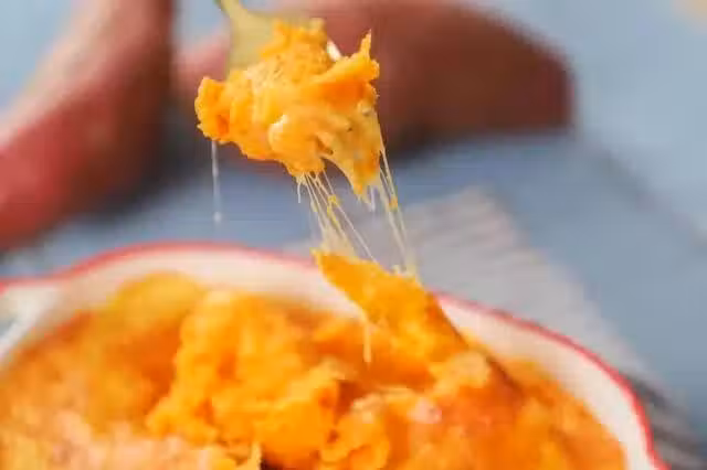 2、紅薯取出,放進烤碗壓碎,趁熱加入白糖、牛奶、芝士碎,拌勻壓成泥,再在上面撒一層芝士碎。