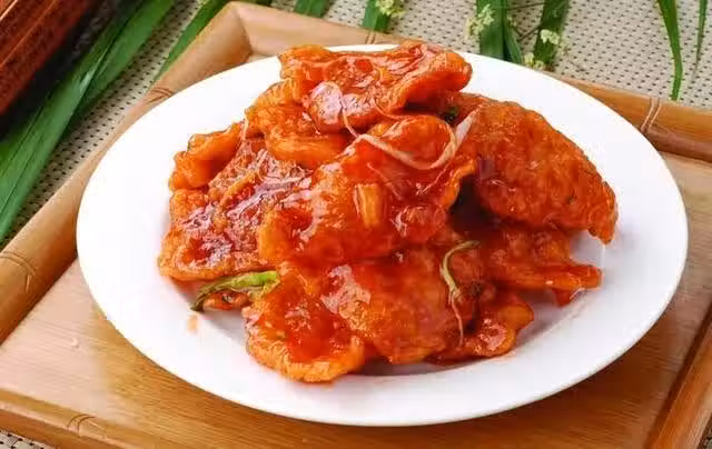6.鍋中留底油,燒熱以後加入炸好的肉片,然後加入薑絲,胡蘿蔔絲,洋蔥絲翻炒。炒勻後加入醬汁,翻炒收汁