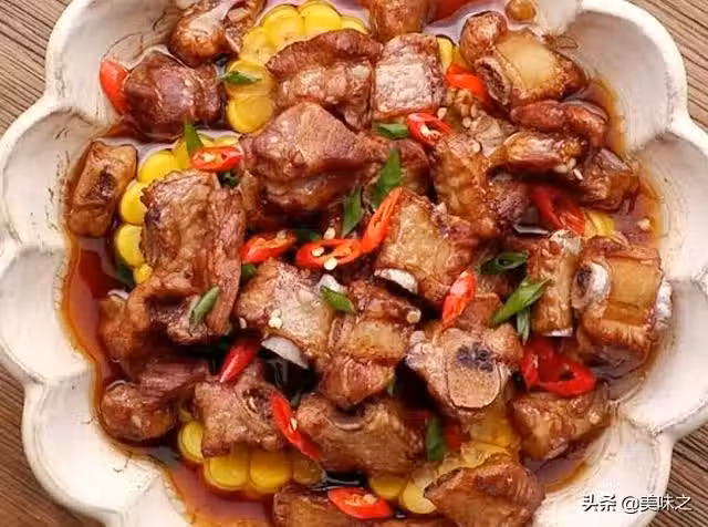 玉米、排骨、鹽、生抽、老抽、蚝油、蒜、蔥花、小米辣。