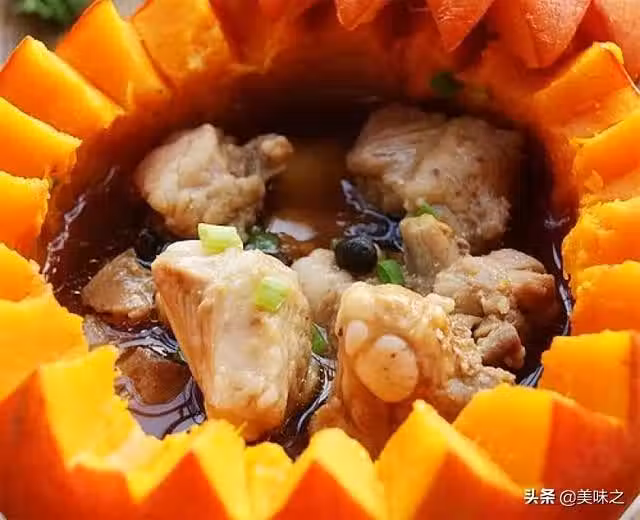 6、文火蒸40-50分鐘,至南瓜熟透、排骨熟爛,撒上蔥花即可。
