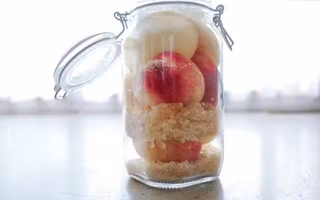 2.找一個大罐子,一層桃子,一層黃晶冰糖碼滿。
