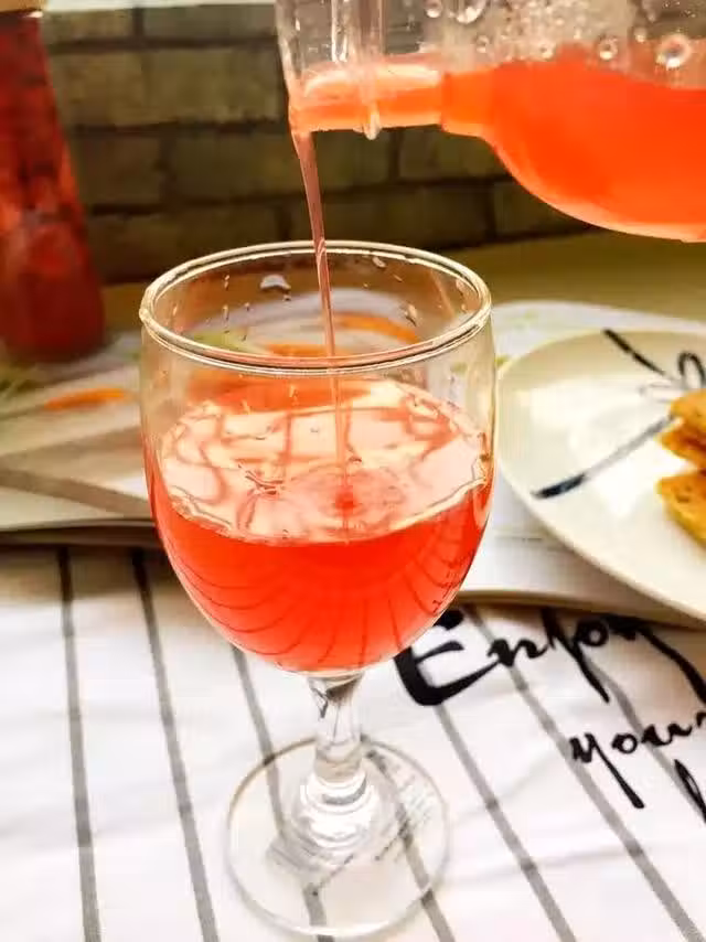 4.玻璃杯開水消毒,倒入白酒,加入經冷藏析出水分的草莓,連水一起與白酒混合,密封放在陰涼處十天,十天後就可以喝了