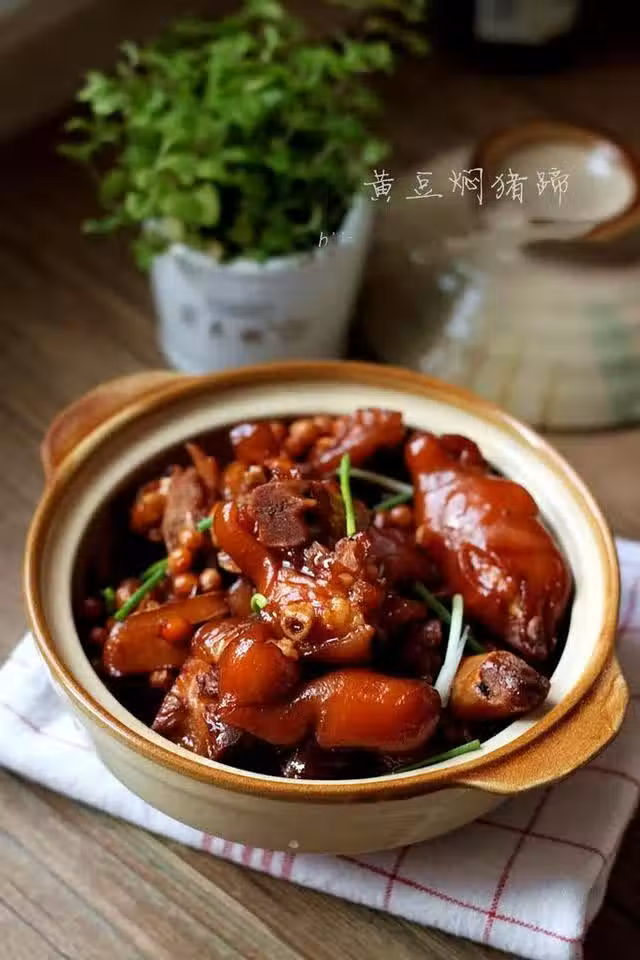 2.鍋內放入適量油,放入薑片;加入豬蹄繼續翻炒片刻;倒入適量生抽,料酒,適量冰糖;加入洗凈的黃豆,及蔥結;加入適量的水;大火煮開後轉小火燉煮至豬蹄酥爛;