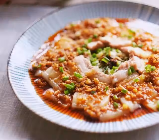 1.花肉洗凈切片,大蒜切成末